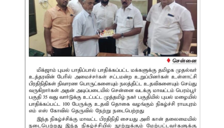 சென்னைமிக்ஜாம் புயல் பாதிப்பால் பாதிக்கப்பட்ட மக்களுக்கு தமிழக முதல்வர் உத்தரவின் பேரில் அமைச்சர்கள் சட்டமன்ற உறுப்பினர்கள் உள்ளாட்சி பிரதிநிதிகள் நிவாரண பொருட்களையும் நலத்திட்ட உதவிகளையும் செய்து வருகிறார்கள்