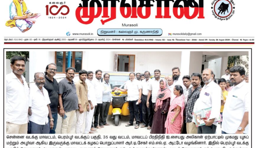 > சென்னை வடக்கு மாவட்டம், பெரம்பூர் வடக்குப் பகுதி, 35 வது வட்டம், மாவட்டப் பிரதிநிதி ஐ.சையது அலிகான் ஏற்பாட்டில் முகமது யூசுப் மற்றும் அபூர்வா ஆகிய இருவருக்கு மாவட்டக் கழகப் பொறுப்பாளர் ஆர்.டி.சேகர் எம்.எல்.ஏ. ஆட்டோ வழங்கினார். இதில் பெரம்பூர் வடக்கு பகுதிச் செயலாளர் அ.முருகன், மாவட்ட துணைச் செயலாளர் எஸ்.ஆர்.கமலக்கண்ணன், வட்டச் செயலாளர் எம்.உமாபதி, அப்துல்லா, ஆசிரியர் அய்யனார், ஆட்டோ இக்பால், நசீர், சாதிக், ஜாகிர் உசேன், சரவணன், ஆசிப், சபீர் அசிஸ் வாகிதா, யாஸ்மின், ஆயிஷா, கவிதா மற்றும் கழகத் தோழர்கள் பலர் உடன் உள்ளனர்.