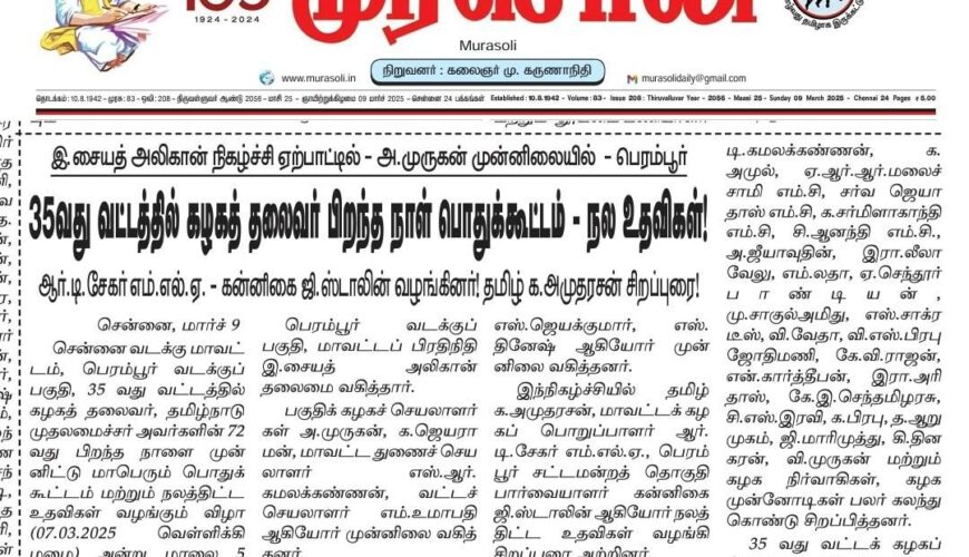 சென்னை, மார்ச் 7- மணிக்கு, 3 வது பிளாக் முத்தமிழ், சிவா மருத் அமைனை அருகில் நடை பெறுகிறது. சென்னை வடக்கு மாவட்டம், பெரம்பூர் வடக்குப் பகுதி, 35 வது வட்டத்தில் கழகத் தலை வர், தமிழ்நாடு முதலமைச் சர் அவர்களின் 72 வது பிறந்த நாளை முன்னிட்டு பெரம்பூர் வடக்குப் பகுதி, மாவட்டப் பிரதிநிதி இ.சையத் அலிகான் தலைமை வசிக்கிறார். மாபெரும் பொதுக்கூட் பகுதிக் கழகச் செய்லா டம் மற்றும் நலத்திட்ட உதவிகள் வழங்கும் விழா இன்று (17.03 2025 வெள் விக்கிழமை) மாலை நடைப்பெட்ரது.