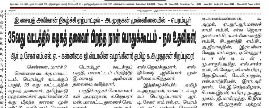 தலைமையில் சென்னை, மார்ச் 7- மணிக்கு, 3 வது பிளாக் முத்தமிழ், சிவா மருத் அமைனை அருகில் நடை பெறுகிறது. சென்னை வடக்கு மாவட்டம், பெரம்பூர் வடக்குப் பகுதி, 35 வது வட்டத்தில் கழகத் தலை வர், தமிழ்நாடு முதலமைச் சர் அவர்களின் 72 வது பிறந்த நாளை முன்னிட்டு பெரம்பூர் வடக்குப் பகுதி, மாவட்டப் பிரதிநிதி இ.சையத் அலிகான் தலைமை வசிக்கிறார். மாபெரும் பொதுக்கூட் பகுதிக் கழகச் செய்லா டம் மற்றும் நலத்திட்ட உதவிகள் வழங்கும்[…..]