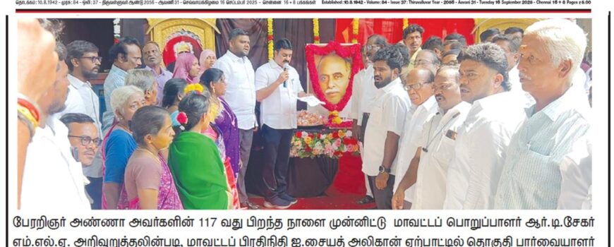 பேரறிஞர் அண்ணா அவர்களின் 117 வது பிறந்த நாளை முன்னிட்டு பெரம்பூர் வடக்கு மாவட்டப் பொறுப்பாளர் ஆர்.டி.சேகர் எம்.எல்.ஏ. அறிவுறுத்தலின்படி, மாவட்டப் பிரதிநிதி ஐ.சையத் அலிகான் ஏற்பாட்டில் தொகுதி பார்வையாளர் கன்னிகை ஜி.ஸ்டாலின், வடக்கு பகுதிச் செயலாளர் அ.முருகன் 35 வது வட்டக் கழகச் செயலாளர் எம்.உமாபதி ஆகியோர் முன்னிலையில் பேரறிஞர் அண்ணா திருவுருவப் படத்திற்கு மலர் தூவி பொதுமக்களுக்கு இனிப்பு வழங்கி சிறப்பாக கொண்டாடப்பட்டது. உடன் பி.செல்வமணி, இ.சல்மான் ஷெரீப், பிரதீப் குமார், ஆ.ஷேக் அப்துல்லா,[…..]