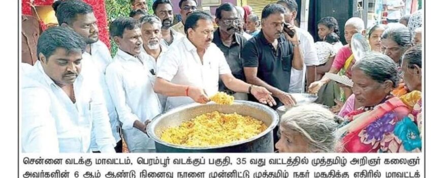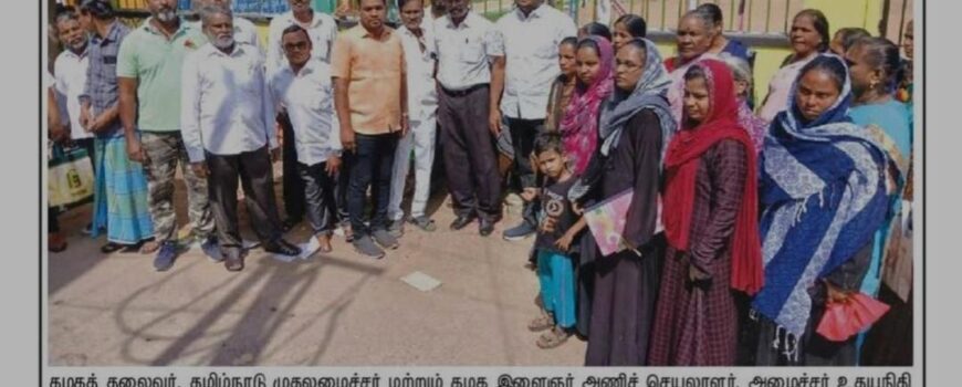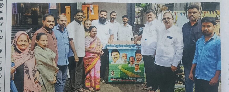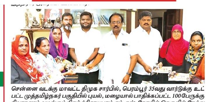 சென்னை வடக்கு மாவட்ட திமுக சார்பில், பெரம்பூர் 35வது வார்டுக்கு உட் பட்ட முத்தமிழ்நகர் பகுதியில் புயல், மழையால் பாதிக்கப்பட்ட 100 பேருக்கு நிவாரணம் வழங்கும் நிகழ்ச்சிராயபுரம் எம்.எஸ்.கோயில் தெருவில் நேற்று நடைபெற்றது. மாவட்ட பிரதிநிதி சையத் அலிகான் தலைமையில், நூற்றுக் கும் மேற்பட்டவர்களுக்கு ₹5 லட்சம் மதிப்பிலான நிவாரண பொருட்களை சென்னை வடக்கு மாவட்ட செயலாளர் தா.இளைய அருணா, தலைமை செயற்குழு உறுப்பினர் இரா.கருணாநிதி ஆகியோர் வழங்கினர். உடன், மருத்துவ அணி துணை அமைப்பாளர் ஷேக்[…..]