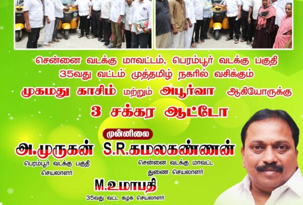 We are delighted to share the news of our successful initiative to distribute free autos to deserving families in North Chennai, marking the spirit of Dravida Month. This meaningful endeavor aimed to empower our community, providing families with a valuable resource to improve their lives. Witnessing the smiles and gratitude of the recipients was truly heartwarming.